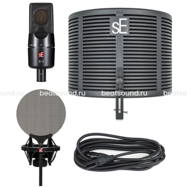 В комплекте: Конденсаторный студийный микрофон SE X1 S, фильтр RF-Х, металлический поп-фильтр, держатель типа паук, 3-х метровый микрофонный кабель