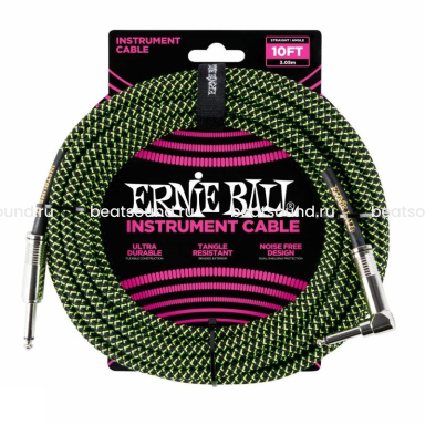 ERNIE BALL 6077 - инструментальный кабель в тканевой оплетке с прямым и угловым джеками, длина 3,05 метра, цвет черный с зеленым. Читать подробнее