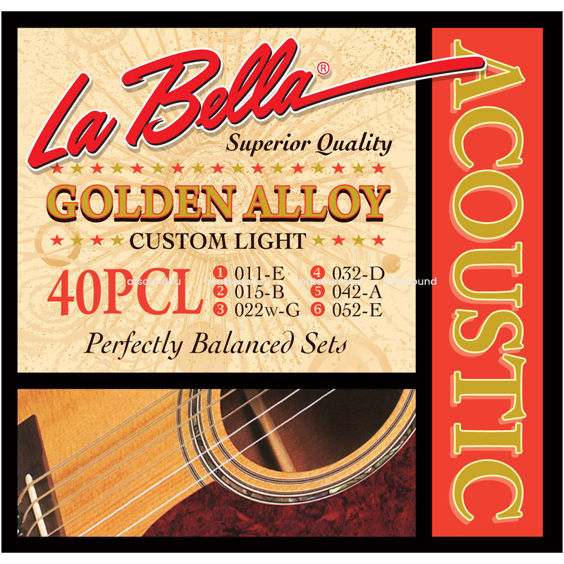 40PCL Custom Light Струны для акустической гитары. Оплетка басовых струн - специальный "золотой" сплав бронзы. 011 015 022W 032 042 052 La Bella Читать подробнее -