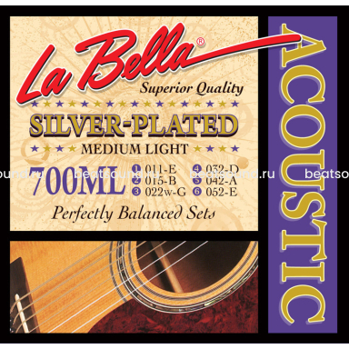 700ML Medium Light Комплект посеребренных струн для акустической гитары. 1 и 2 струны - сталь, 3,4,5,6 - стальной керн в оплетке из посеребренной меди. 011 017 022W 032 042 052 La Bella США Читать подробнее -