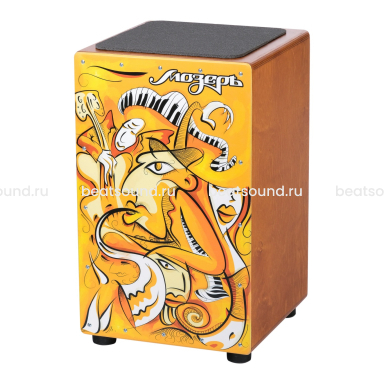 Кахон с пружинами в березовом корпусе для насыщенного басового звучания, резонаторная сторона из березы 3мм, цвет корпуса черный, тапа с принтом блюз.