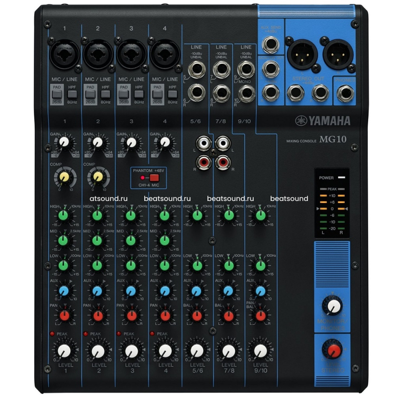Переключаемое фантомное питание и PAD переключатель Со своим фантомным питанием MG10 позволяет Вам взять все преимущества полного частотного диапазона и высококачественных конденсаторных микрофонов. PAD переключатель на Mic/Line входах смягчает пиковые сигналы, которые соответствуют инструментам снимаемых микрофоном во время исполнения, избегая ограничения сигнала, который может серьезно испортить Ваш микс.