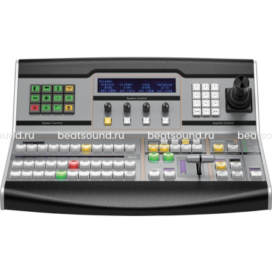 Специальное меню системного управления из 12 кнопок с подсветкой позволяет быстро настраивать и изменять необходимые параметры. Над четырьмя рядами многофункциональных клавиш и ручками управления находится большой дисплей, с помощью которого можно отображать данные и выполнять точную настройку. Меню системного управления оформлено в виде многоуровневого списка, что делает навигацию очень удобной. Можно изменить параметры кеинга и переходов с вытеснением, медиаплееров и генераторов цвета, настройки видеомикшера, дополнительных выходов и других элементов.