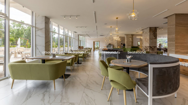 Фоновое музыкальное сопровождение для ресторанов Green Tea, Grape и двух залов Lounge реализовано с использованием встраиваемой акустики бренда BS ACOUSTICS, лицензированный аудиоконтент в каждом зале воспроизводится с помощью Apple iPad, интегрированного в интерьер ресторана.
