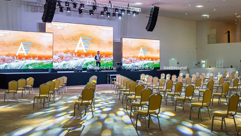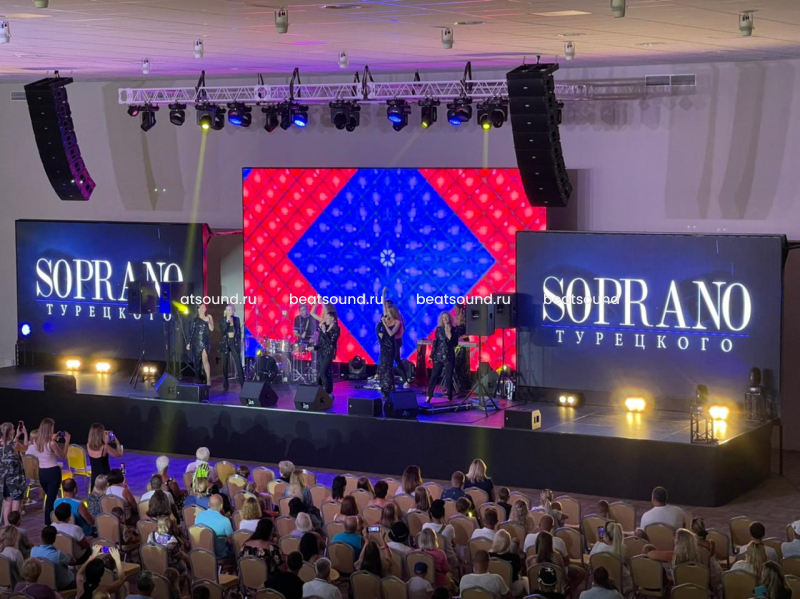 Банкетный зал GREAT HALL - самый большой конгресс-центр и event-площадка в г.Анапа. Общая площадь - 5000 м2. Универсальный зал оснащен звуковым, световым и видеотрансляционным оборудованием для проведения частных и коммерческих мероприятий любого формата, вместимость зала - до 700 человек. Звуковое оснащение представлено двумя кластерами линейного массива бренда FBT (Италия), суббасовыми системами, frontfill, outfill и delay-системами, маршрутизация аудиосигналов реализована на базе цифрового протокола Dante, оборудование видеокоммутации - BlackMagicDesign, система управления концертным и интерьерным светом - Nicoaudie Sunlite III. Многофункциональный зал оснащен всеми необходимыми средствами коммутации дополнительного видео/аудиооборудования для трансформации под любые задачи заказчика.
